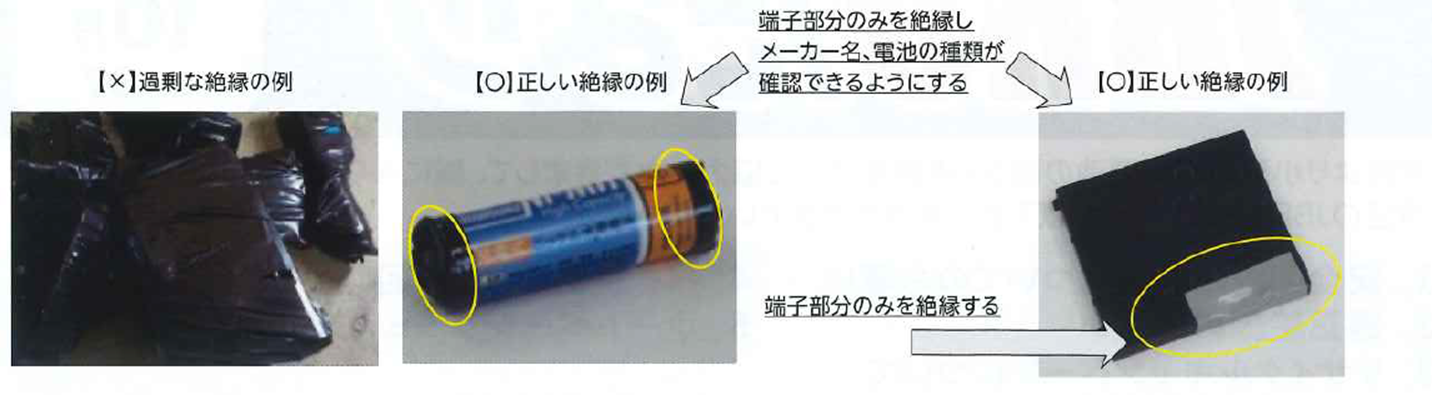 絶縁テープは、端子部分のみでお願いします。テープを電池全体に貼るとリサイクルができなくなる場合があります。