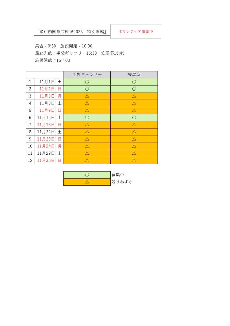【瀬戸内国際芸術祭2025】 10月21日現在、特別開館に関わるボランティアスタッフの募集と現状についてお知らせします。【開催期間】 【謝 礼 】 【お問合せ先】  |
