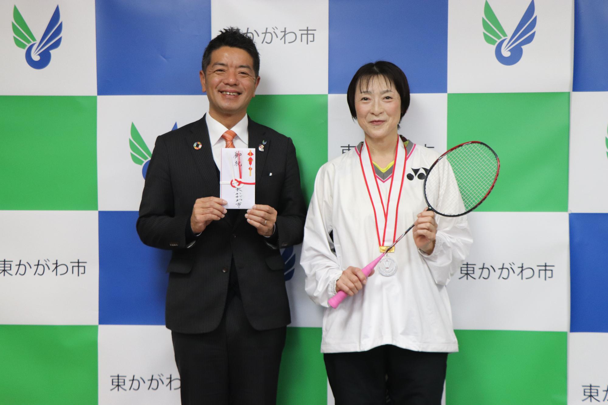 東かがわ市内在住の武田 かおりさんが、第20回全日本レディースバドミントン競技大会 ダブルス個人戦の年齢別ブロックで準優勝に輝かれました。このご報告のため、表敬訪問にいらっしゃいました。